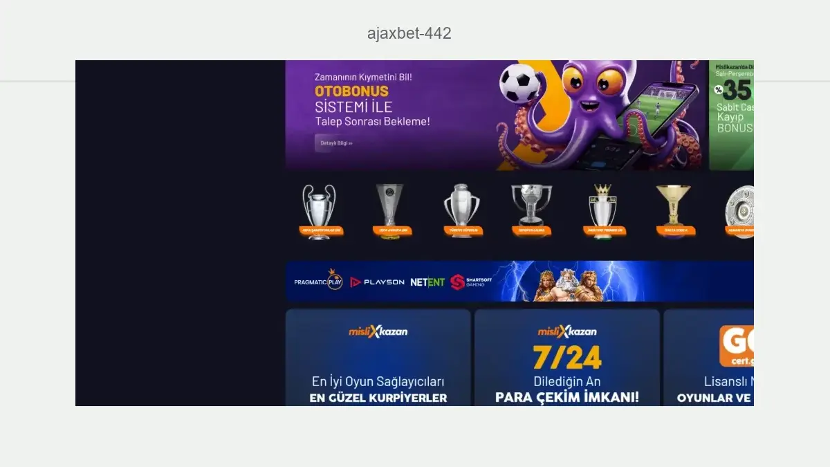 Ajaxbet 442 bahis; Türkiye'de legal olarak faaliyet göstermeyen bir web sitesi olmasından dolayı Ajaxbet 442 giriş adresi sık sık erişime kapanmaktadır. Ajaxbet 442 giriş adresi, kapatılması sonrası güncellenerek kullanıcıların sorun yaşamadan giriş yapması için yeni bir giriş adresinden yayın yapmaktadır. Firmanın adresinin kapatılması bazen çok kısa sürelerde yaşanırken bazen de bir kaç gün boyunca aynı giriş linki kullanılabilmektedir.