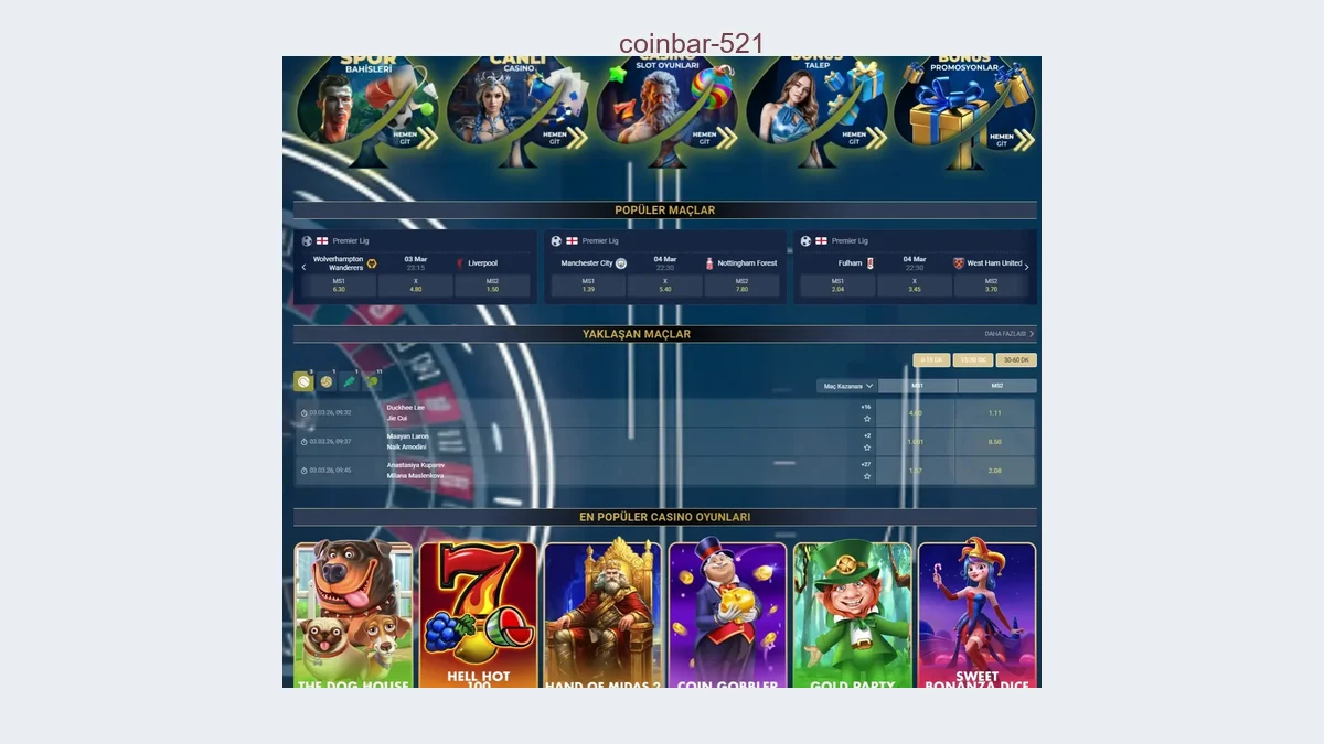 Coinbar 521 bahis giriş adresinin linki sitemizde mevcuttur ve her adres yenileme döneminde yenilenmektedir. Platformun yeni adresine sorunsuz erişim sağlamak amacıyla bu sayfayı sık kullanılan siteler alanına eklemenizi tavsiye ederiz.