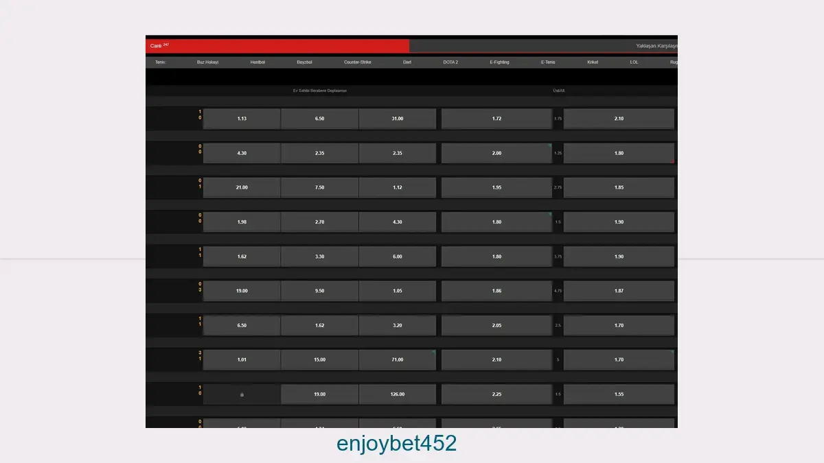 Enjoybet452 bahis; Türkiye'de yasalara uygun yayın yapmayan bir platform olduğu için giriş adresi sıklıkla erişime kapanmaktadır. Enjoybet452 ve benzeri yabancı bahis sitelerinde bahis yapanlar kapanma problemiyle çok sık karşılaşmışlardır. Bütün bahis firmaları bu sorunu giriş adreslerini yenileyerek aşmaktadırlar. Bundan dolayı sitenin domaininin sıklıkla değiştiğini gözlemleyebilirsiniz.
