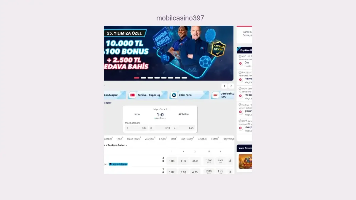 Bilindiği gibi bütün yabancı bahis sitelerinde olduğu gibi Mobilcasino397 sitesinin de giriş adresi periyodik olarak engellendiğinden bundan sonra firmanın son adresine giriş yapmak için Mobilcasino397 adresini kullanınız. Mobilcasino397 giriş linkiyle direkt olarak siteye ulaşabilirsiniz. Aşağıda Mobilcasino397 yeni giriş için detaylar ve giriş butonu yer almaktadır. Mobilcasino397 giriş bağlantısı engellendikçe sitede yer alan bağlantı da güncellenir. Mobilcasino397 giriş adresi güncellendikçe aşağıdaki Mobilcasino397 giriş bağlantısı da güncellenmektedir. Firmaya giriş yapmak için Mobilcasino397 yeni giriş butonunu kullanabilirsiniz.
